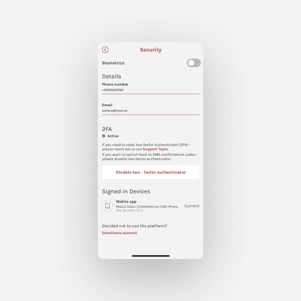 For convenience and security, swissmoney offers biometric verification as an alternative to entering a session passcode each time you open the app. This single-factor method uses unique physical traits such as fingerprints or facial features to confirm your identity.